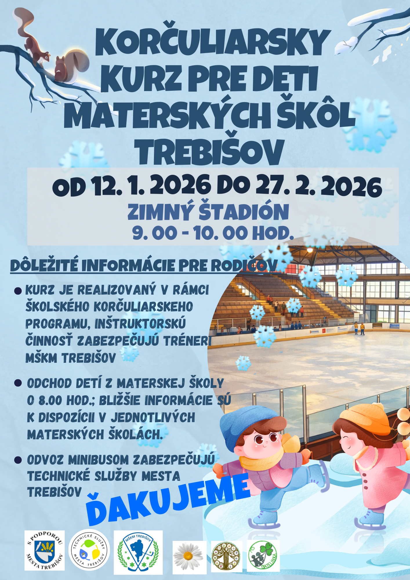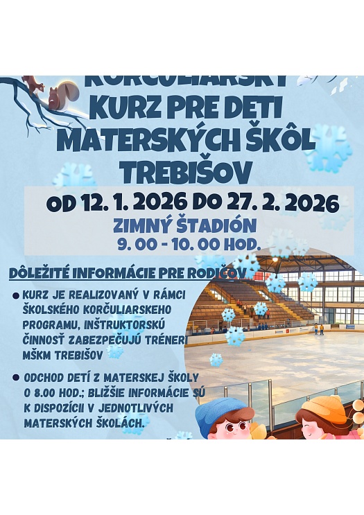 Korčuliarsky kurz prebieha v termíne od 12. januára do 27. februára 2026, denne v čase od 9:00 do 10:00. Odvoz detí na zimný štadión zabezpečujú Technické služby mesta Trebišov.