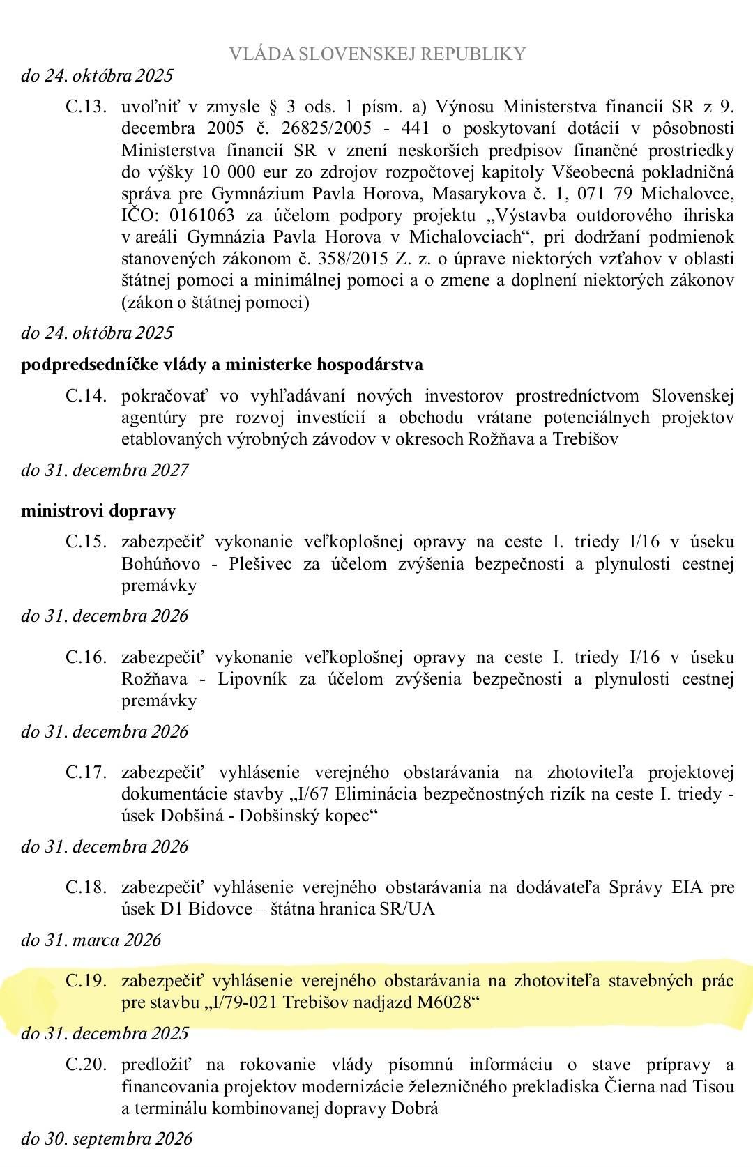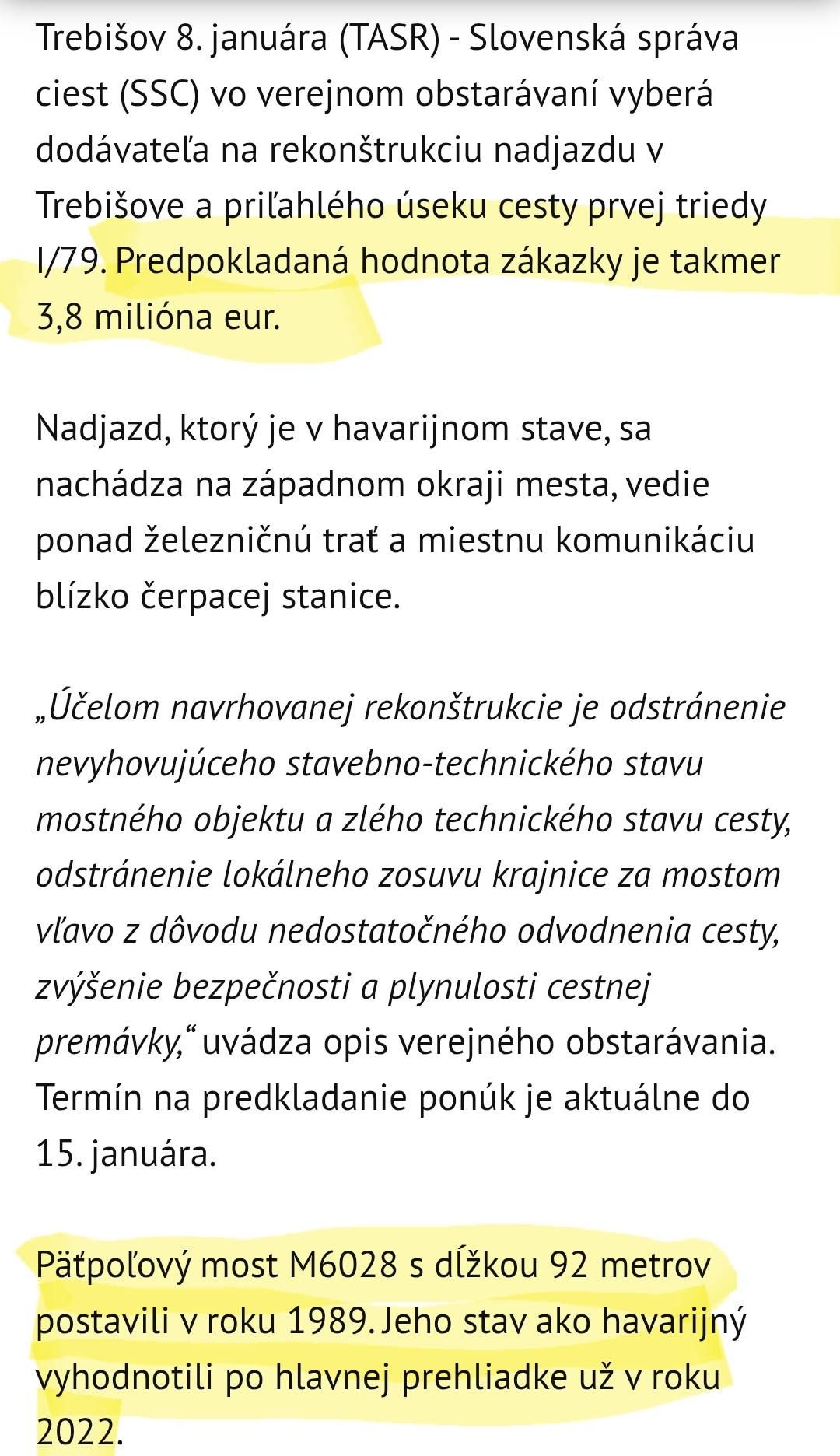 Ako informovala TASR, v aktuálnom období prebieha verejné obstarávanie na zhotoviteľa stavebných prác rekonštrukcie MOSTA M6028 (tzv. „ruskovský nadjazd“) na mestskej výpadovke, s predpokladanou hodnotou zákazky 3,8 milióna eur. Úloha prípravy tejto investície Slovenskej správy ciest vyplynula z prijatého uznesenia vlády SR na výjazdovom rokovaní v Borši 24. októbra 2025.