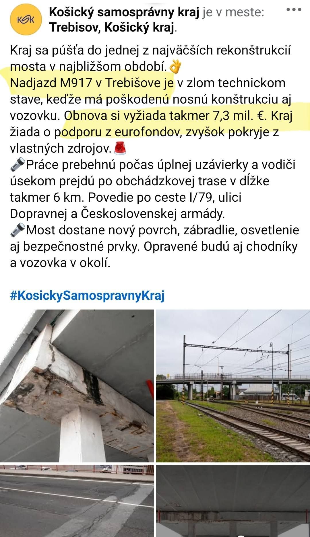Zároveň prebieha aj záverečná fáza prípravy druhej investície (Košický samosprávny kraj) - kontrola verejného obstarávania (ÚVO) na zhotoviteľa stavebných prác rekonštrukcie MOSTA M917 (nadjazd pri OC Lidl) s predpokladanou hodnotou zákazky 7,3 milióna eur.