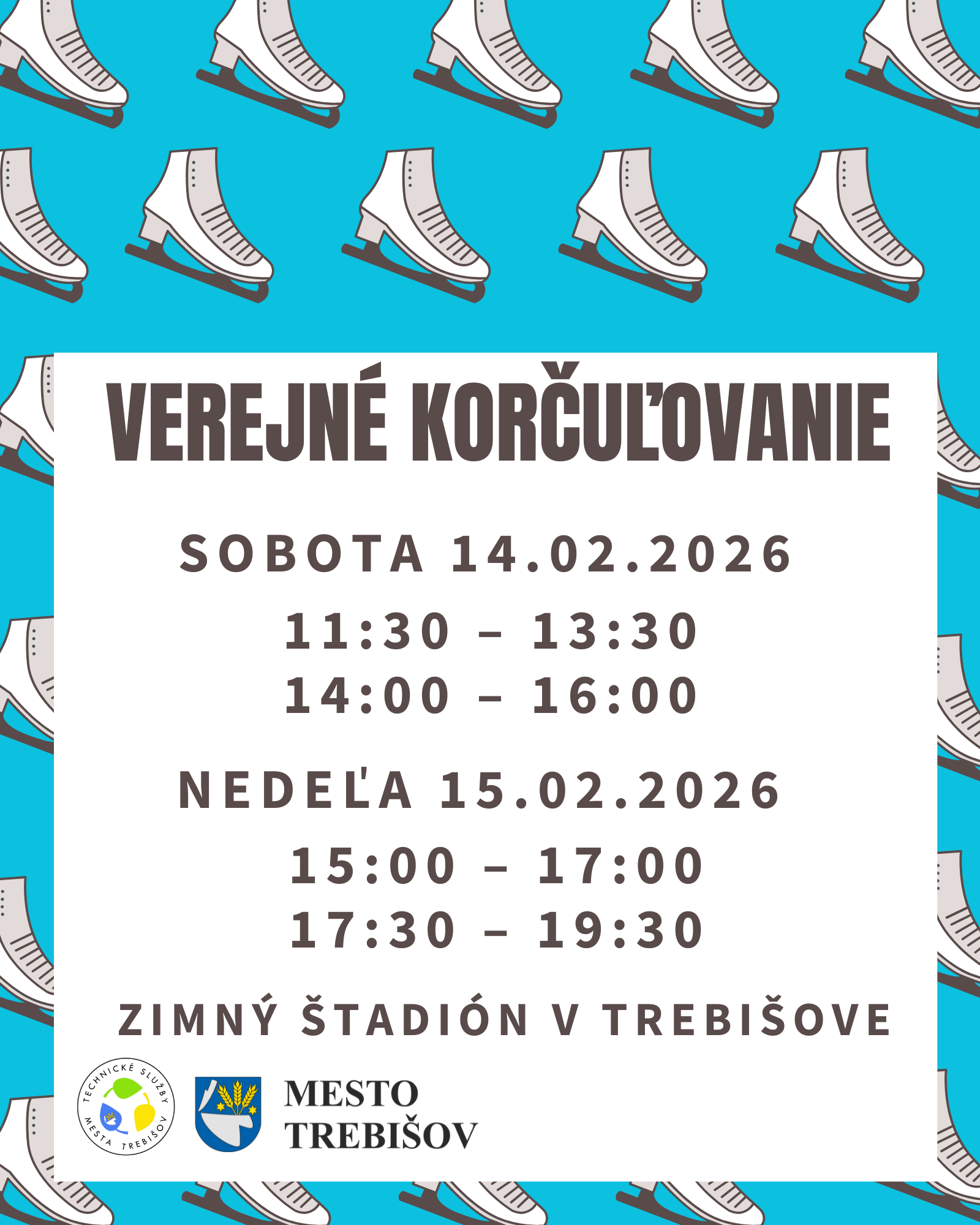 Ľadová plocha zimného štadióna je pre vás pripravená v uvedených časoch.