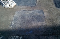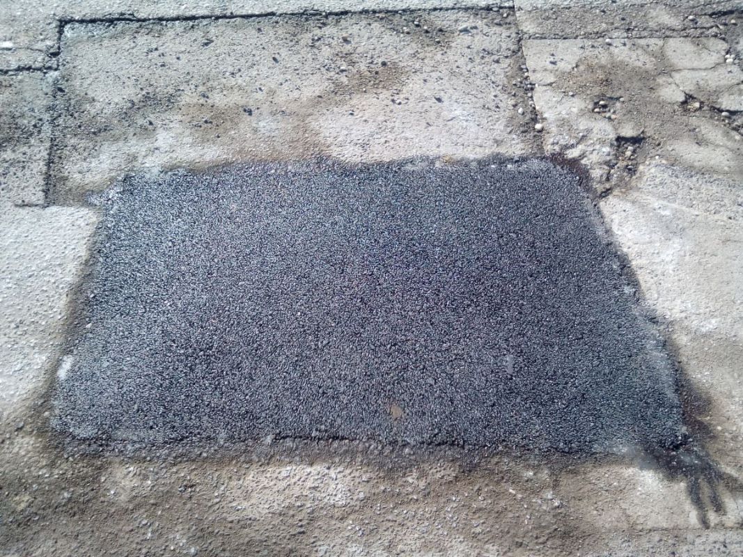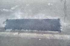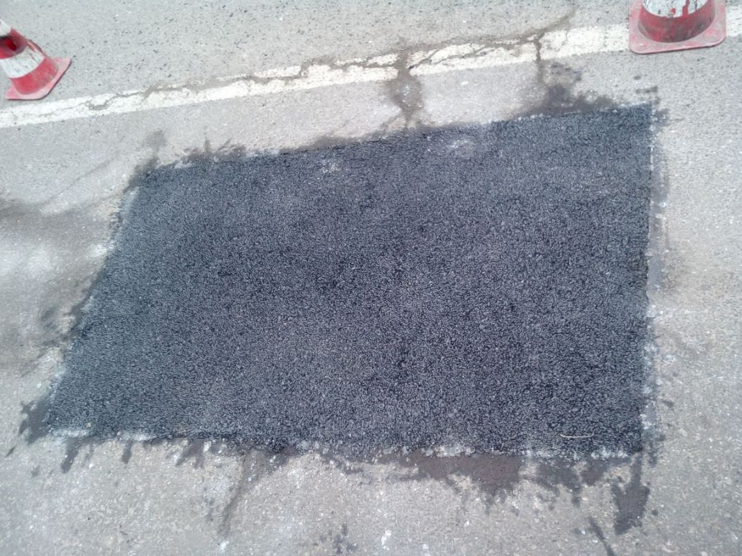 V mieste výtlku na úseku cesty vyrežú dieru, ktorú zasypú studenou asfaltovou zmesou CANADER a následne ju zhutnia prístrojom.