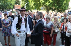Predsedu vlády a ministrov privítala pred budovou Mestského kultúrneho strediska, kde sa uskutočnilo rokovanie, miestna folklórna skupina Furmaňe.