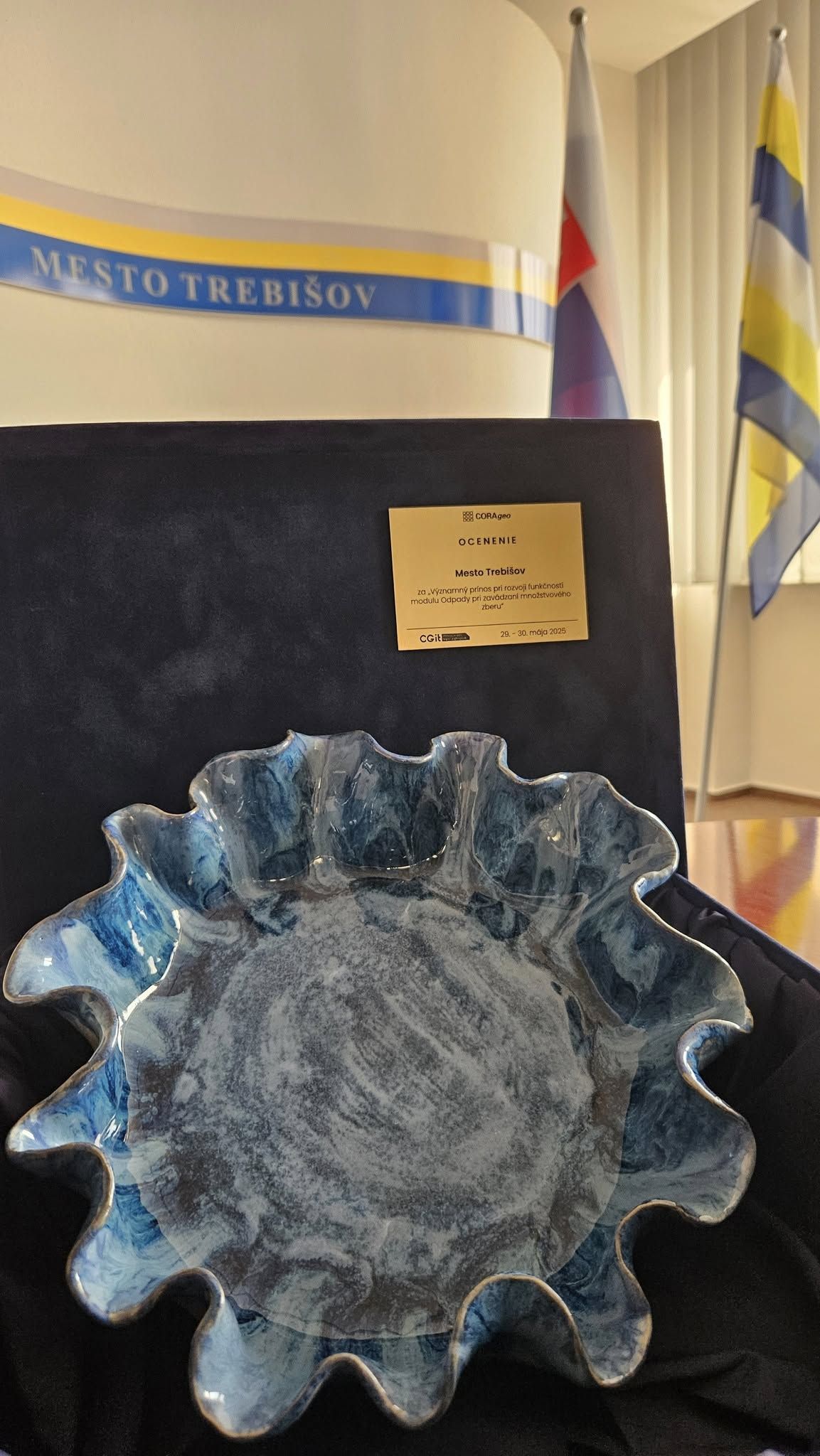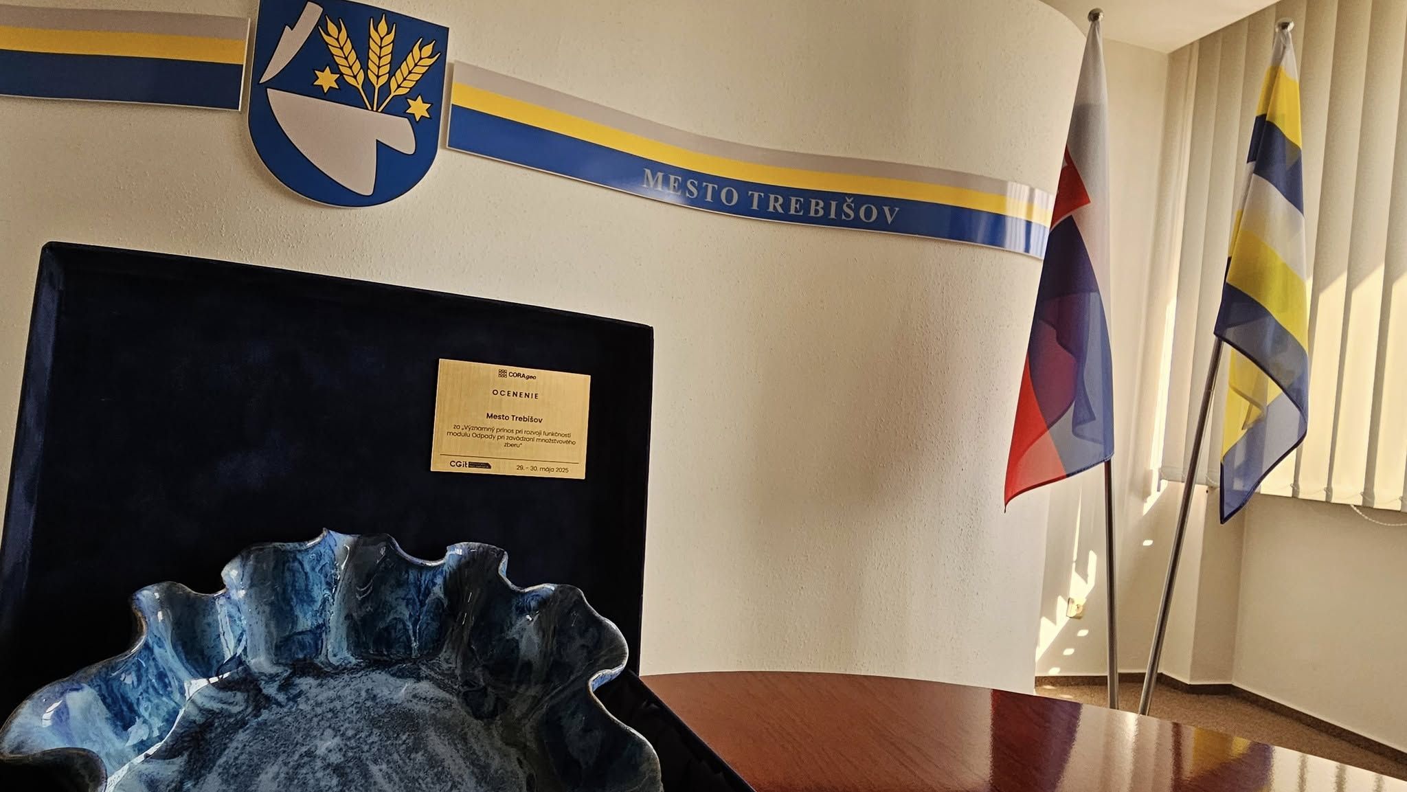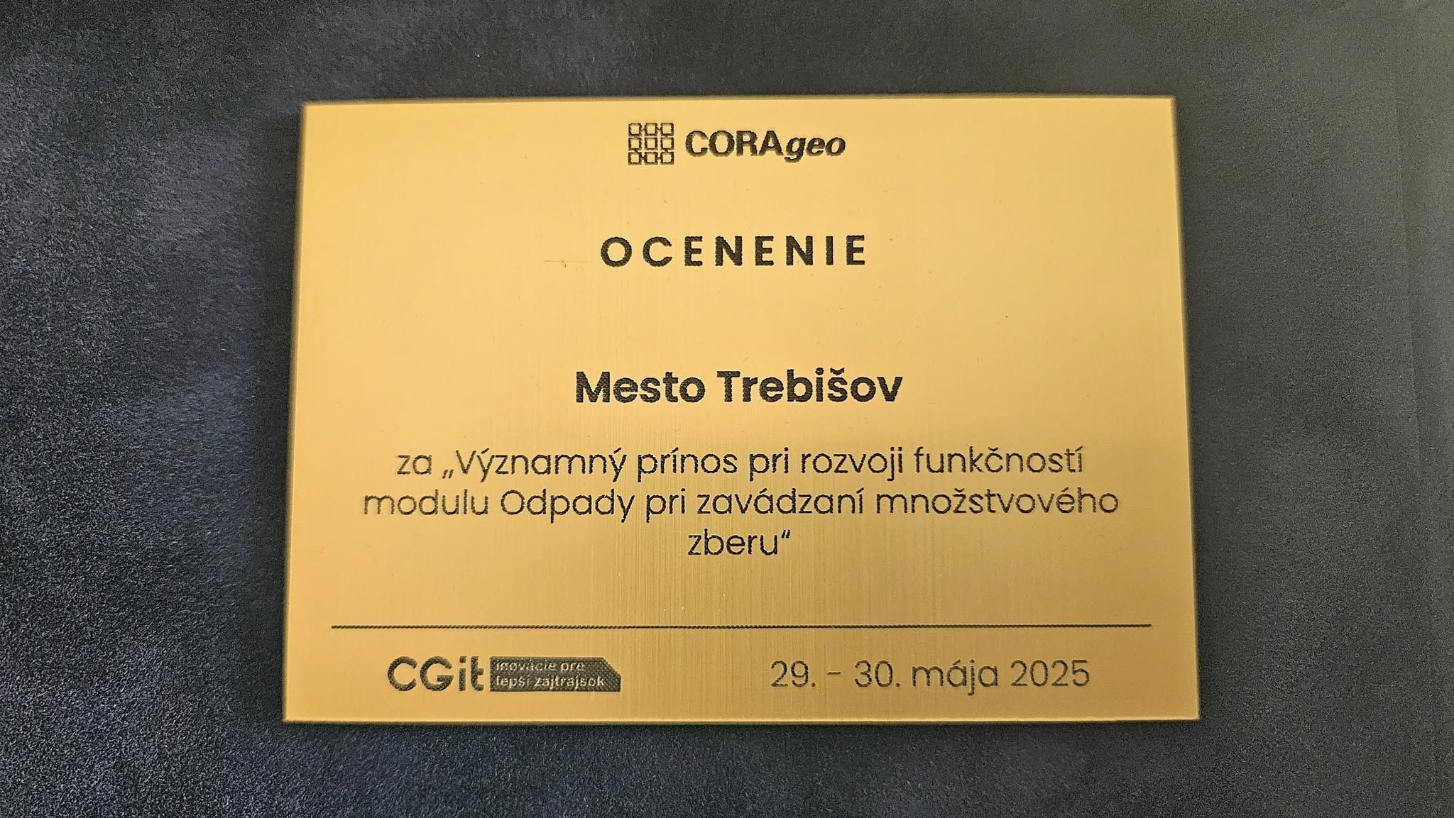 Ocenenie od spoločnosti CORAgeo za ,,Významný prínos pri rozvoji funkčností modulu ODPADY pri zavádzaní množstvového zberu" a inšpiráciu pre mnohé ďalšie samosprávy na Slovensku aktuálne patrí mestu Trebišov a jej organizácii Technické služby mesta Trebišov.