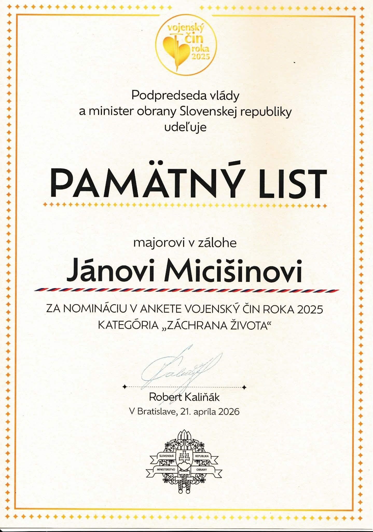 Medzi nominovanými v kategórii Záchrana života bol aj Trebišovčan Ing. Ján Micišin, ktorý si na slávnostnom galavečeri prevzal pamätný list za svoju nomináciu.