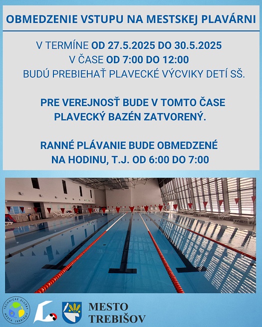 V termíne od 27.5.do 30.5.2025 v čase od 7:00 do 12:00 hod. budú prebiehať plavecké výcviky detí stredných škôl.